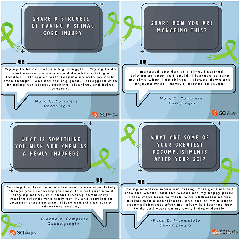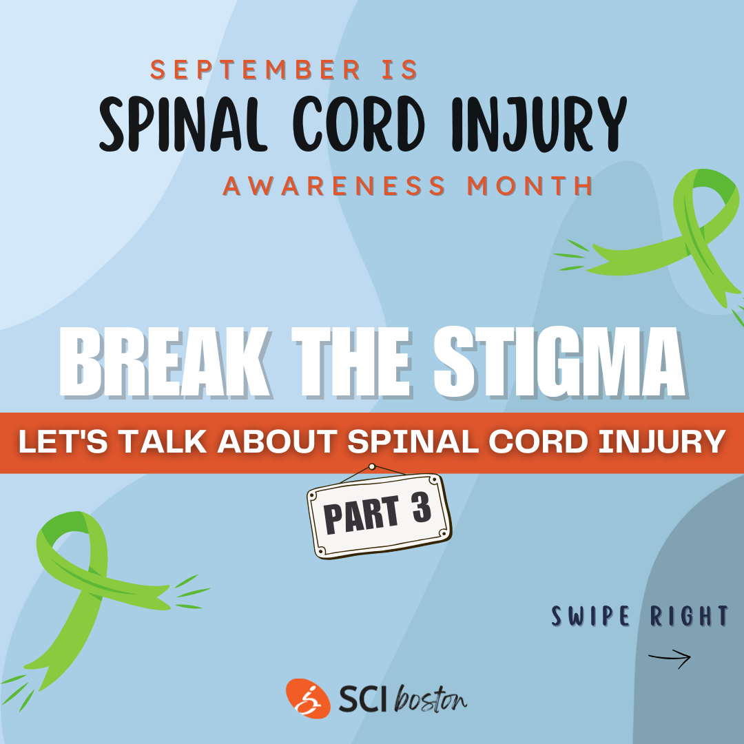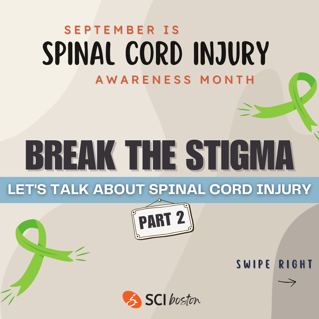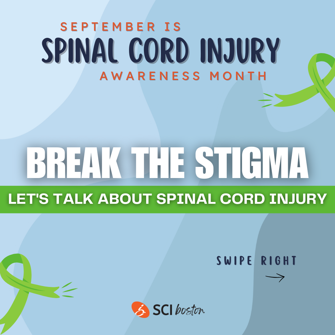 |  | | SCI Awareness on Social Media Our Social Media Coordinator, Thalita, has been busy posting informative and fun posts to raise awareness about spinal cord injury this past month. Follow us on all of our socials (Instagram, Facebook, LinkedIn, YouTube) so that you don't miss a thing! If you are an individual living with an SCI or a family member or caregiver of someone with an SCI, you can join our private Facebook Group here! And if you are not on social media, Thalita spent time this month engaging with our community to ask pertinent questions about living with a spinal cord injury. Scroll to the bottom of the Newsletter to see her Break the Stigma social media posts for SCI Awareness Month! We also did our first collab with Peer Mentor, support group leader, and social media influencer, Josh Keller! Josh took us through a typical Thursday for him as he prepared to lead SCIboston's Thursday SCI Support Group. His blog is insightful, honest, and a really good read. Here's a snippet: Morning Routine At 7 AM my wife’s alarm clock goes off and our day begins. The bulk of Kass’s caregiving work happens in the morning and at night. She helps me catheterize while I’m turned on my side. She then leaves to feed the dogs and let them outside. After making her coffee, she comes back in to help me transfer using a SureHands ceiling lift into my shower wheelchair. Read his full blog here! |