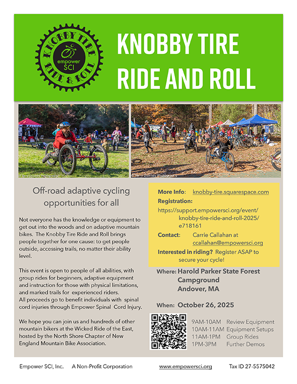| | | Knobby Tire Ride and Roll Where: Harold Parker State Forest Campground Andover, MA When: October 26, 2025 Off-road adaptive cycling opportunities for all. Not everyone has the knowledge or equipment to get out into the woods and on adaptive mountain bikes. The Knobby Tire Ride and Roll brings people together for one cause: to get people outside, accessing trails, no matter their ability level. This event is open to people of all abilities, with group rides for beginners, adaptive equipment and instruction for those with physical limitations, and marked trails for experienced riders. We hope you can join us and hundreds of other mountain bikers at the Wicked Ride of the East, hosted by the North Shore Chapter of New England Mountain Bike Association. Bikes are limited. Contact us ASAP! More Info: knobby-tire.squarespace.com Contact: Carrie Callahan at ccallahan@empowersci.org |
